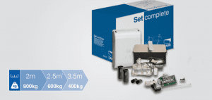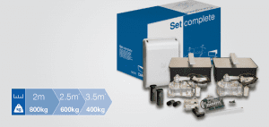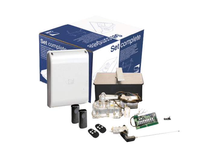 Complete kit for a pair of swing gates of up to 3.5m / 11’5″ each leaf, 230 V A.C. motors.
