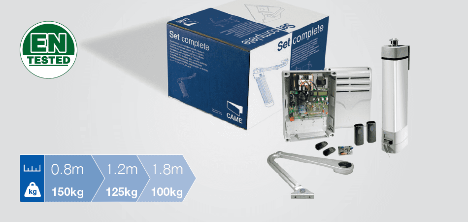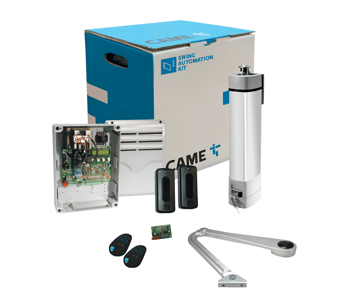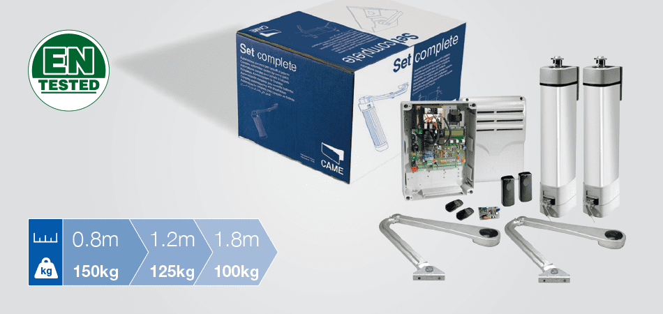 Complete kit for a single or pair of swing gates of up to 1.8m / 6′ each leaf, 24 V A.C. motors.
